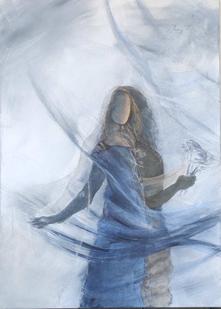 Dit expressieve mixed media portret toont een gelaagd spel van vormen en gezichten en onderzoekt verandering, identiteit en innerlijke beweging.